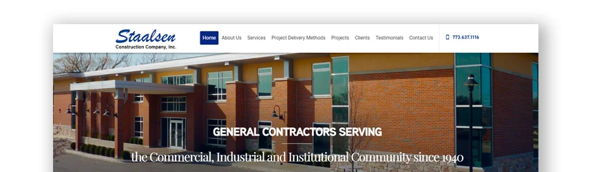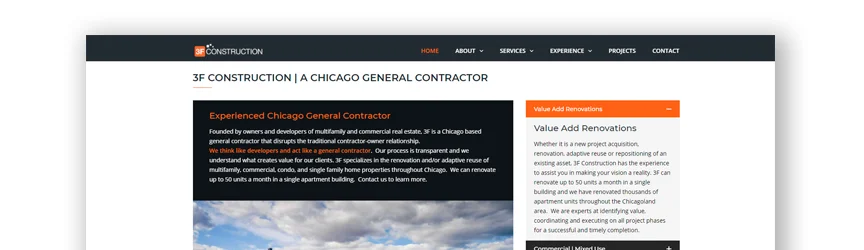 該承包商網站首先分享他們的業務目標。 他們表明,無論項目大小,他們都為自己所做的工作感到自豪。 他們的作品集位於主頁上,您可以查看每個項目的詳細信息。 在頁面的末尾,他們分享了他們曾為之熟悉的公司。