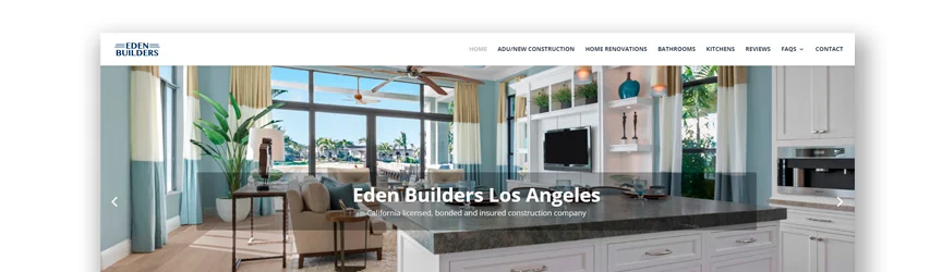 Eden Builders 有一個非常簡單的網站。 顏色為海軍藍和白色,讓人感覺輕鬆自在。 易於找到聯繫信息和聯繫表格,從而很容易找到它們。 此外,他們通過電子郵件訂閱提供房主提示。