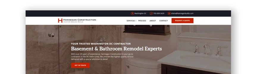 這個示例站點非常清楚地說明瞭如何與訪問承包商頁面的人進行交流。 在頁面的頂部、中間和底部,他們談論取得聯繫。 這表明他們想听聽你的意見。 他們通過說他們擁有 20 多年的經驗來建立信任,並提供保修。 他們展示了一個非常有吸引力的浴室,裡面有一個大浴缸和淋浴。 針對希望翻新或建造新家的人。