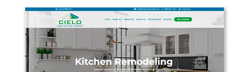 這個示例承包商網站立即顯示了他們提供的項目。 使用圖片和綠色配色方案保持網站簡單。 在頁面底部,他們分享來自滿意客戶的推薦,以幫助潛在客戶。 他們在商業和住宅的分離方面做得很好。