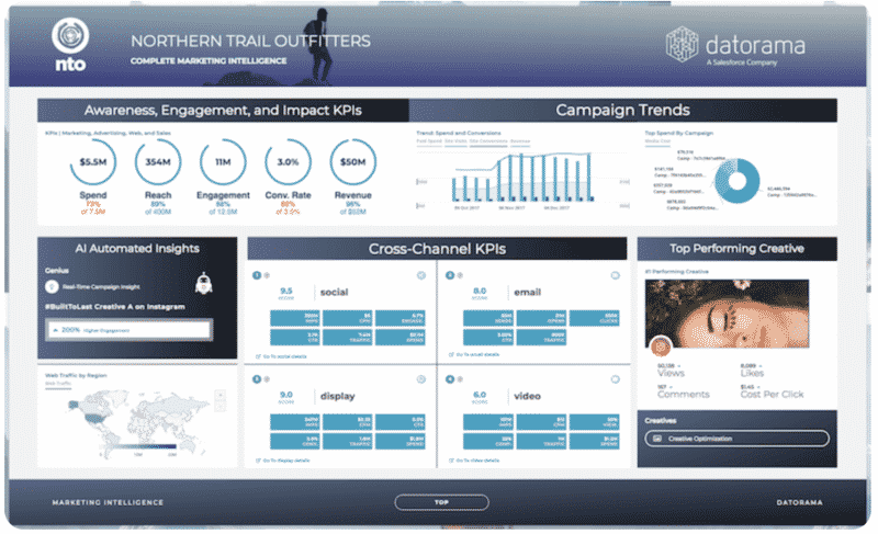 Datorama 提供了一個包含 150 多個 API 連接器的擴展庫,可自動解釋和分類營銷數據以及其他類型的數據,如銷售、天氣、經濟或調查信息。 它們一起從任何來源捕獲所有活動和交互數據,包括 Salesforce Marketing Cloud、Google Analytics 等等,例如付費和自然搜索以及社交、展示和視頻廣告、程序化、電視和離線數據。 從那裡,Datorama 顯示有關可以在儀表板和應用程序中可視化的不同營銷活動的見解。 營銷人員及其代理機構可以根據其 KPI 和受眾細分自定義儀表板,這將發出 AI 驅動的 Einstein 建議和關鍵警報。