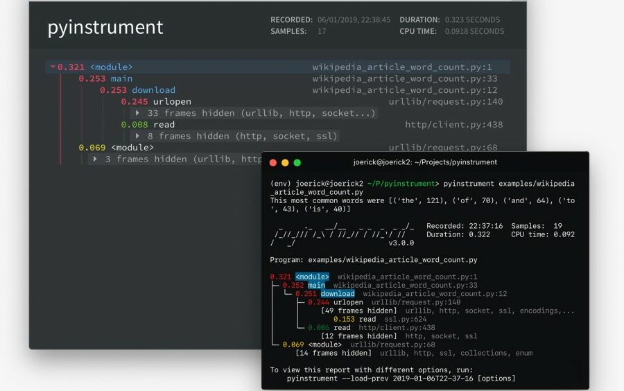 調試性能問題變得更加容易,因為 Pyinstrument 記錄了使用“掛鐘”時間所花費的時間。 該工具會跟踪程序讀取文件、下載數據、與數據庫通信等的所有時間。