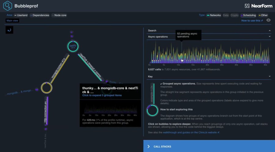 Bubbleprof 通過查看特定操作組(可以是您的代碼、節點核心或模塊)中的氣泡大小來確定操作時間。 它還可以將相鄰的組用棍棒打散以減少混亂。