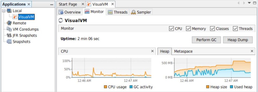 可以使用 VisualVM 執行檢測和採樣分析器,以進行內存管理和應用程序性能。 它顯示線程轉儲以提供對進程的快速洞察。 它還根據需要查看和創建 .hprof 快照,以幫助您發現堆使用效率低下和調試內存洩漏。