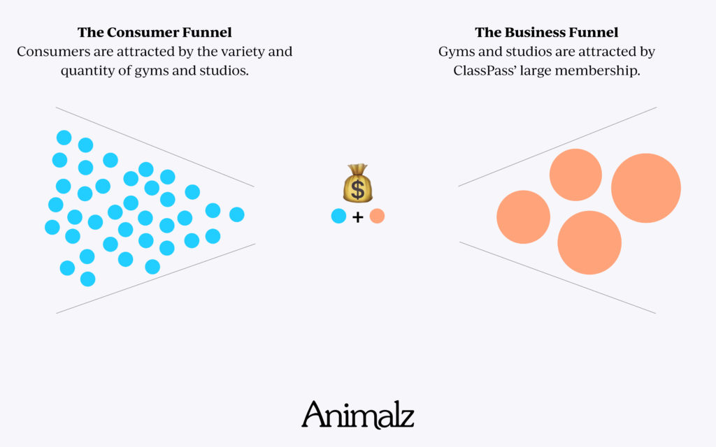 在市場的一方面,ClassPass 向消費者出售會員資格。 另一方面,他們與健身房和工作室合作。 市場根據供求關係運行——他們需要會員吸引健身房與他們合作,他們需要健身房讓他們的產品對消費者感興趣。 這意味著他們必須向兩個截然不同的群體進行營銷。