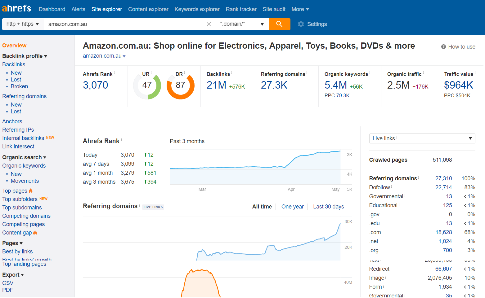 您會在下面的概覽示例中註意到數據呈現方式與其他儀表板的不同之處。 非常關注反向鏈接和域引用,並提供了搜索欄下最重要指標的清晰概覽快照。