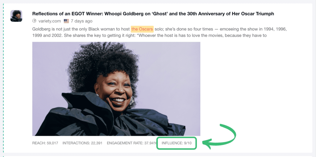 對於每一次提及,Mediatoolkit 都會計算影響力得分。 這個影響力分數實際上是一個從 1 到 10 的數字,表示特定提及源與其他所有源相比的影響力。 數字越低,受眾和影響力越小; 數字越高,來源的影響力越大。