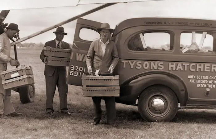 泰森帝國始於大蕭條時期,當時約翰·W·泰森(John W. Tyson)“裝上他的舊卡車,開始向其他辛勤工作的人運送優質雞肉”。