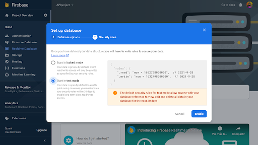 下一步是為您的數據庫配置基本安全規則。 您可以選擇鎖定模式,然後根據需要分配訪問權限,或者選擇啟用所有讀取和寫入的測試模式。