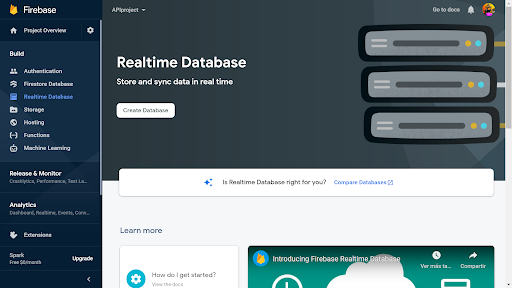 在左側導航欄中的“開發”部分中,單擊“實時數據庫”。 右側將出現一個“創建數據庫”按鈕。 單擊它以在 Firebase 中創建您的第一個數據庫。