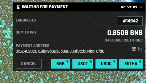 在這個元宇宙中購買土地與我們目前討論的內容非常相似。 第一步是選擇特定的六邊形並單擊添加到購物車。 隨後,選擇可用選項(BNB、USDT等)打開Metamask完成交易。