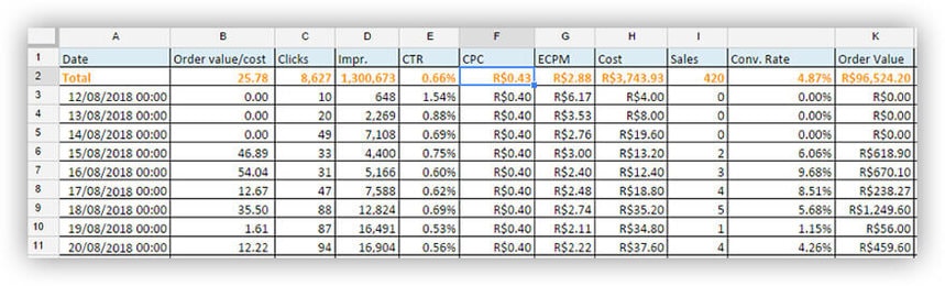 為此,請轉到您的 Criteo 帳戶,按天分解您需要的報告,然後使用導出功能下載文件。 然後在 Google 表格中打開它。 你會得到這樣的表: