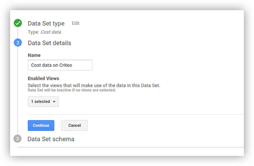 為數據集取一個名稱——例如,“Criteo Costs”——然後選擇要加載數據的 Google Analytics 視圖。 然後點擊繼續: