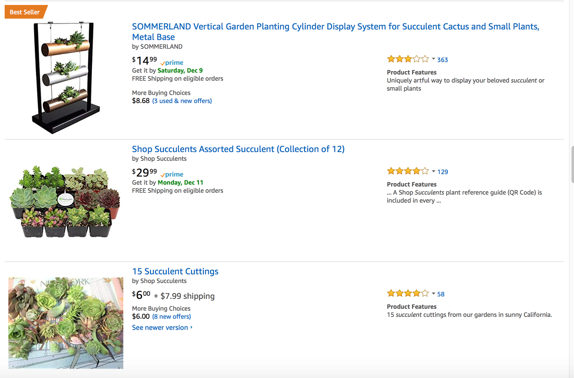 - 您看到了充分利用既定需求的機會:如果您看到類似產品的大量銷售量,並且同時看到讓自己在競爭中脫穎而出的機會,那麼在亞馬遜上銷售是很有意義的。例如,有數十家供應商在亞馬遜上銷售多肉植物; 然而,賣家 Sommerland 能夠通過銷售與市場上其他商品不同的三層垂直花園,在競爭中脫穎而出。 從本質上講,銷售可以為大量關鍵字排名但與其他供應商不同的產品的商家可以獲得首頁展示位置並贏得不了解它們的客戶。重要的是要注意,列表獲得的正面評價越多,可能性就越大亞馬遜將其置於搜索結果的頂部。 雖然並非不可能,但要獲得銷量高且獲得 4 星和 5 星評論數以千計的產品的頭把交椅是困難的。
