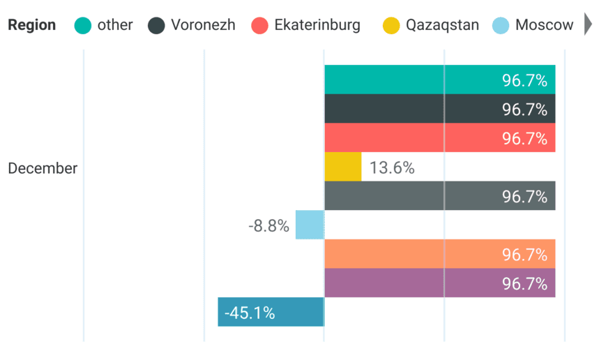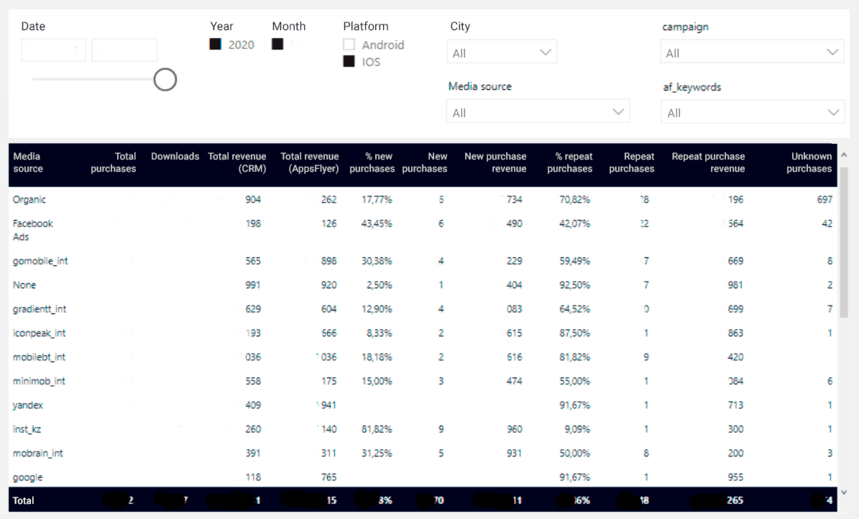 上面的報告表明,網站所有流量的新購買數量最多的是 inst_kz (81.82%)、Facebook Ads (43.45%)、mobrain_int (31.25%) 和 gomobile_int (30.38%)。 因為,一般來說,該公司擁有活躍和忠誠的受眾以及很高的市場覆蓋率,所以很明顯為什麼有些網站會引導那些已經在應用程序中至少下過一次訂單的客戶。 為了提高獲客 KPI 的效率和執行力,團隊可以嘗試在廣告活動設置中排除活躍的 CRM 受眾,並為新客戶推出促銷活動。