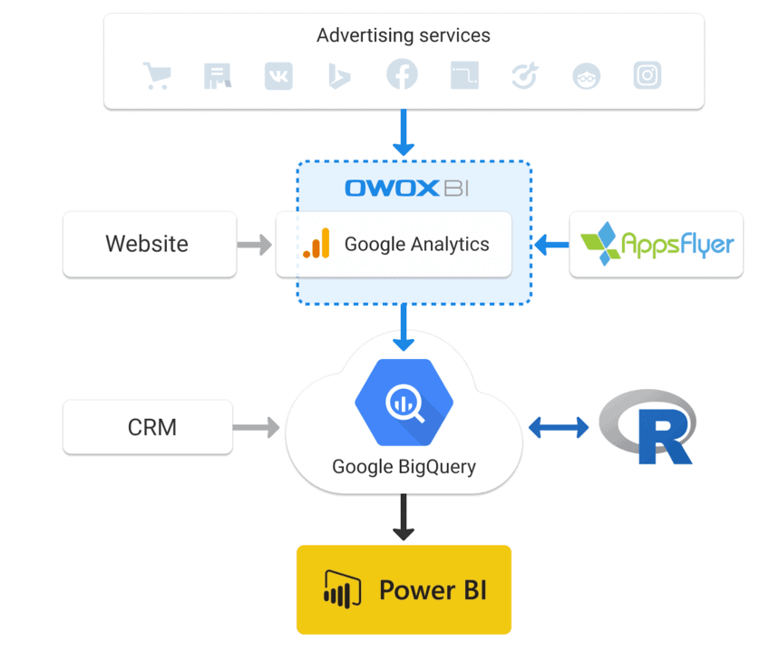 該團隊基於 OWOX BI、Google BigQuery 和 Power BI 構建了高級分析。 從示意圖上看,系統如下所示: