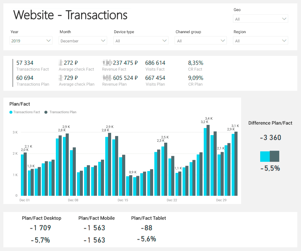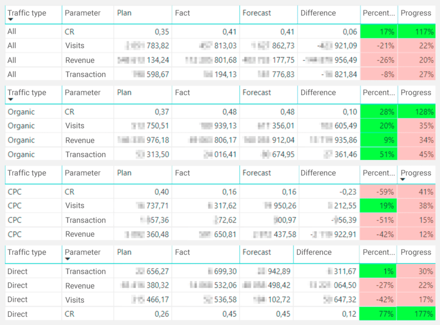 該報告說明了計劃和實際 KPI(CR、訪問、收入、交易)與預測值的上層對應關係。 例如,您可以看到未達到網站整體流量的計劃,但這被自然流量和直接流量中較高的 CR 所抵消。 因此,有必要通過更動態的優化或增加購買價格來增加付費流量(CPC 類型)的 CR。 團隊可能還需要原則上增加購買付費流量,以完成總體流量計劃。