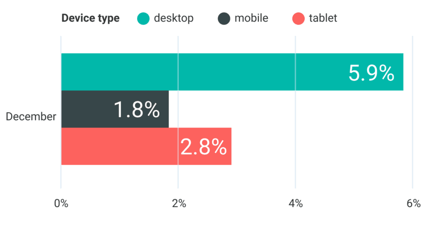 在這裡,可以看出移動流量 (1.8%) 和平板電腦流量 (2.8%) 在 12 月份的 CR 最低。 由於移動流量帶來的轉化次數與桌面流量相同,而且可能更便宜,因此營銷人員可以嘗試通過購買質量更好的流量來提高其 CR 來優化移動流量。