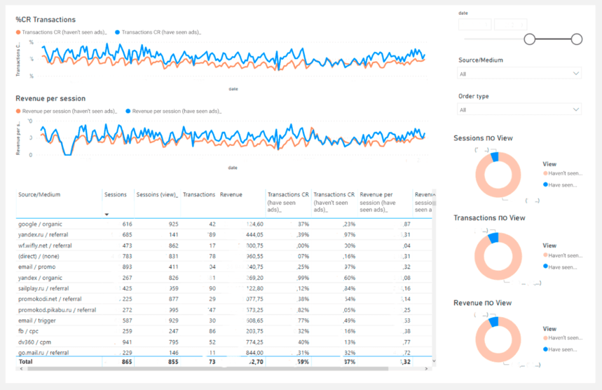 由於這些報告,該團隊可以將所有購買分為新客戶和回頭客。 這使得可以將回頭客排除在針對新客戶的廣告活動之外,從而降低所有渠道的 CPO。 通過在渠道部分同時查看回訪用戶和新用戶的統計數據,營銷人員能夠了解哪些來源帶來了更多新訂單,並將預算向有利於他們的方向傾斜。 在重複採購盛行的資源中,他們減少了預算,從而減少了計劃的 CPO 總量。