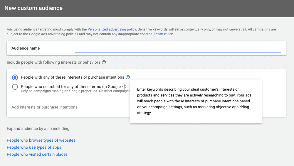 除了再營銷受眾之外,Google Ads 還允許您根據潛在客戶的生活方式、購買習慣、長期興趣、購買意圖和人口統計數據創建不同的自定義受眾。
