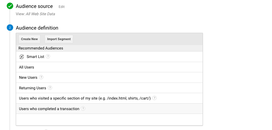 - 自定義組合:幫助您組合兩個或多個現有的再營銷列表或受眾來測試各種策略。