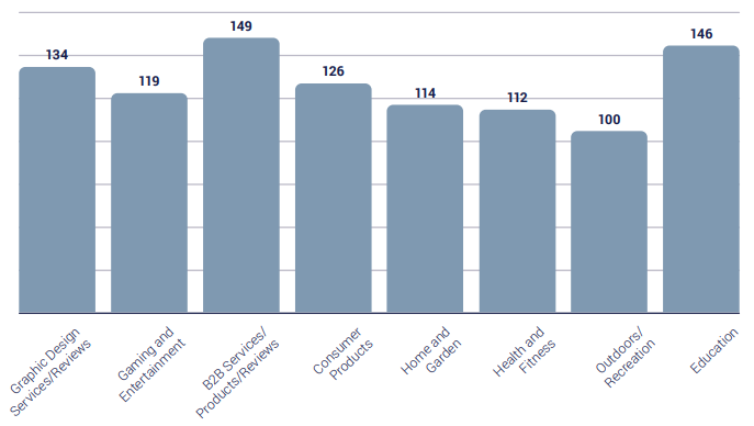 有很多獨特的內容很難放在一個利基中,但一些最常見的利基如下圖所示,以及每個利基的平均倍數。 常青利基市場通常需要更高的倍數,但所有網站都能夠找到與其內容相關的受眾。 從 2021 年銷售的內容網站樣本中,我們建立了一個基本銷售倍數並將其設置為 100,以展示我們看到的每個利基市場的相對倍數。