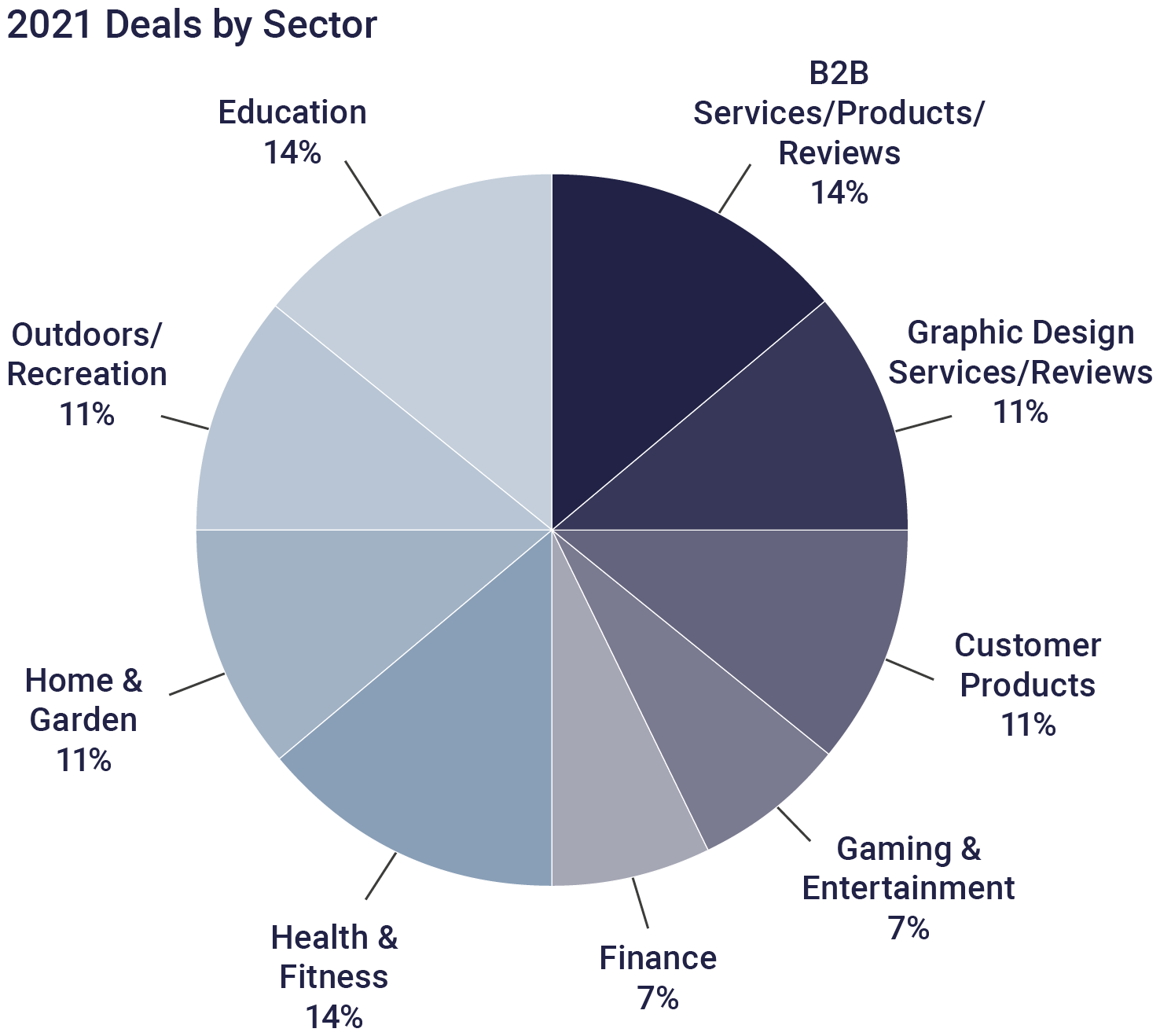 仔細看看我們在 2021 年完成的交易,我們發現交易按行業分佈在 B2B 服務/產品/評論、教育、健康和健身領域,各佔 14%。 戶外/休閒、家居和花園、平面設計服務/評論和消費品各佔交易的 11%。 最後,遊戲與娛樂和金融行業占我們完成的交易的 7%。