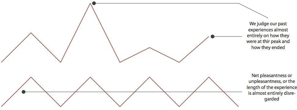 訪問網站是一種持續一定時間的體驗。 在此期間,體驗的強度可以上升和下降。 訪客可能喜歡您提供的折扣,但討厭您的商店頁面太慢。 這些波動的結構決定了經驗是否會被記住是積極的。 研究表明,經驗流中有一種模式決定了它會如何被記住。 人們在高峰期和末期的經歷決定了他們的整體感受。 這種所謂的峰終規則是網站開發中不可或缺的工具,因為它允許設計人員優化網站的用戶體驗以獲得最大的影響。 換句話說,確保你的高點真的很高,而你的低點不明顯。