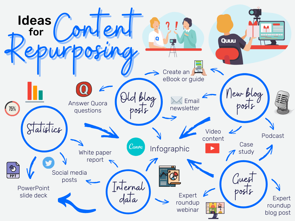 充分利用現有作品,將它們重新用於電子書、網絡研討會或視頻教程等格式,以吸引新的觀眾。 例如,從現有博客文章創建電子書,從播客創建網絡研討會,從信息圖表創建視頻教程。