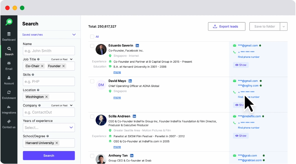 ContactOut 是最受歡迎的電子郵件查找軟件解決方案之一。 它提供了一種強大而可靠的聯繫信息搜索方式,讓用戶可以快速訪問 LinkedIn 個人資料以獲取有關特定線索的更多詳細信息。