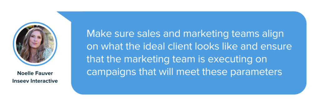 Inseev Interactive 的總監 Noelle Fauver 說:“銷售團隊將他們的團隊用於合格的潛在客戶非常重要,您可能有 100 個潛在客戶,但如果他們沒有預算或您不是正確的解決方案,那麼潛在客戶將無效. 確保銷售和營銷團隊與理想客戶的外觀保持一致,並確保營銷團隊正在執行符合這些參數的活動。 定期評估您的銷售團隊的成交率並確定是什麼阻止了更高的成交率,並在銷售和營銷團隊中實施以解決這個問題。”