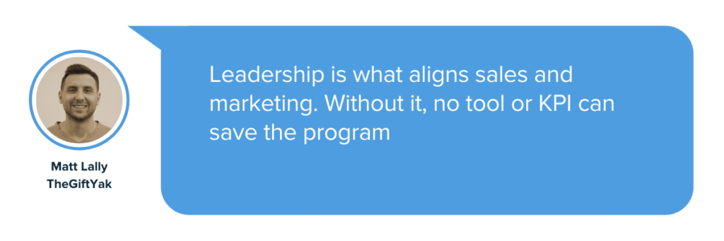 TheGiftYak 的創始人 Matt Lally 同意,“領導力是使銷售和營銷保持一致的因素。 沒有它,任何工具或 KPI 都無法挽救程序。”