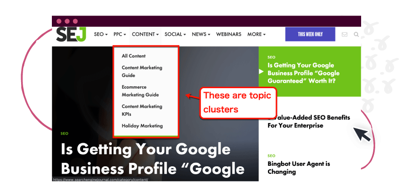 例如,搜索引擎期刊使用支柱頁面作為其主題集群的核心。 如果您從主菜單單擊一個類別,您將被重定向到鏈接到集群帖子的廣泛內容。