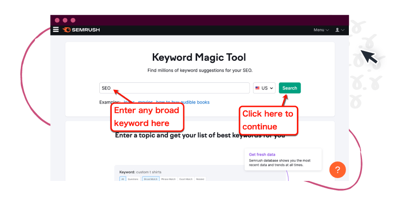 對於支柱頁面,SEMrush 的關鍵字魔術工具等關鍵字研究工具可以幫助完成兩個步驟:發現集群主題想法和研究集群帖子的關鍵字。