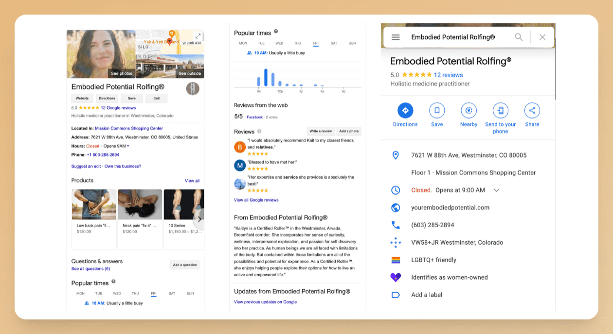 整體醫學從業者體現的潛力羅爾芬就是一個很好的例子。 無論搜索者是在 Google 搜索還是 Google 地圖上查找,該公司的 GMB 個人資料都充滿了有用的信息。