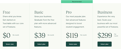 Teachable 提供四種計劃:免費、基本、專業和商業。