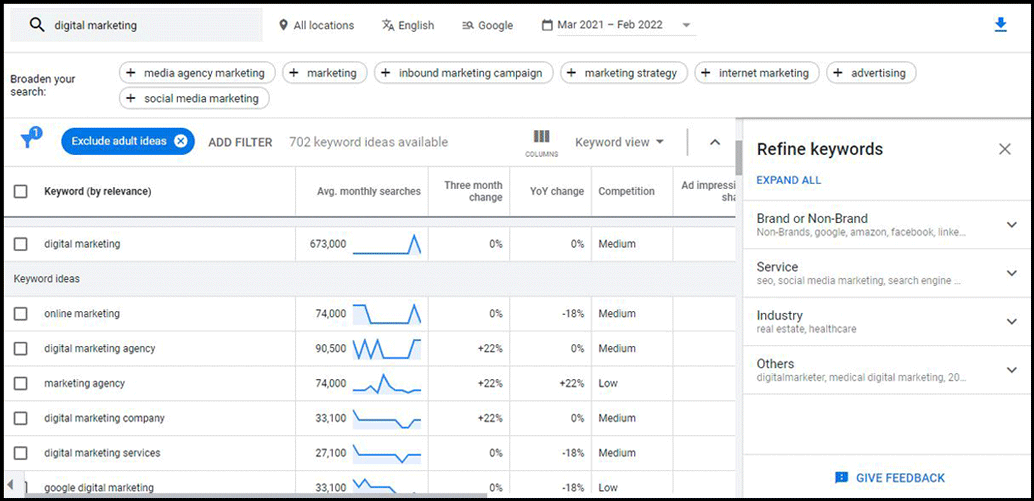 關鍵字規劃師還可以了解特定關鍵字的競爭、每月搜索和出價。 該流程可以幫助您在運行按點擊付費廣告系列時獲得更多潛在客戶。 您還可以在搜索關鍵字之前輸入網站的鏈接。 這將使您了解競爭對手內容中排名最高的關鍵字。