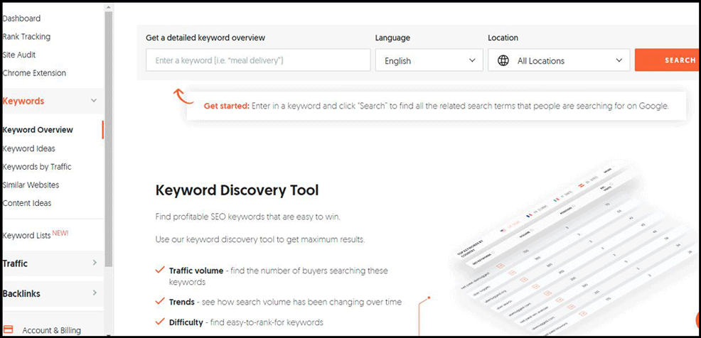 要為您的網站找到相關的關鍵字集,您所要做的就是輸入最能描述您計劃編寫的內容的種子詞。 它會生成列表和每月搜索量、競爭以及關鍵字難度等其他詳細信息。 唯一可能讓人們對使用這個關鍵字規劃器猶豫不決的是它的價格。 它在規模上更昂貴,但值得一分錢。