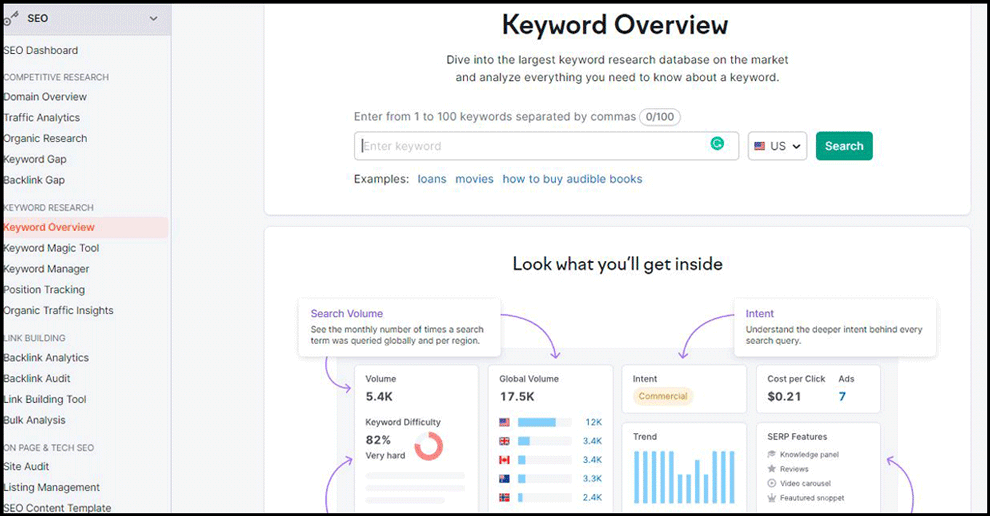 Semrush 已成為SEO 服務提供商中最值得信賴的關鍵字規劃工具之一。 該規劃師以其競爭對手中最大的關鍵字集合而聞名。 可用數據的質量也非常出色,使其成為最佳選擇。 這個關鍵字規劃器最好的部分是語義相關的關鍵字,這些關鍵字在提高排名方面最有用。 該算法的爬蟲更好地識別語義相關的單詞。