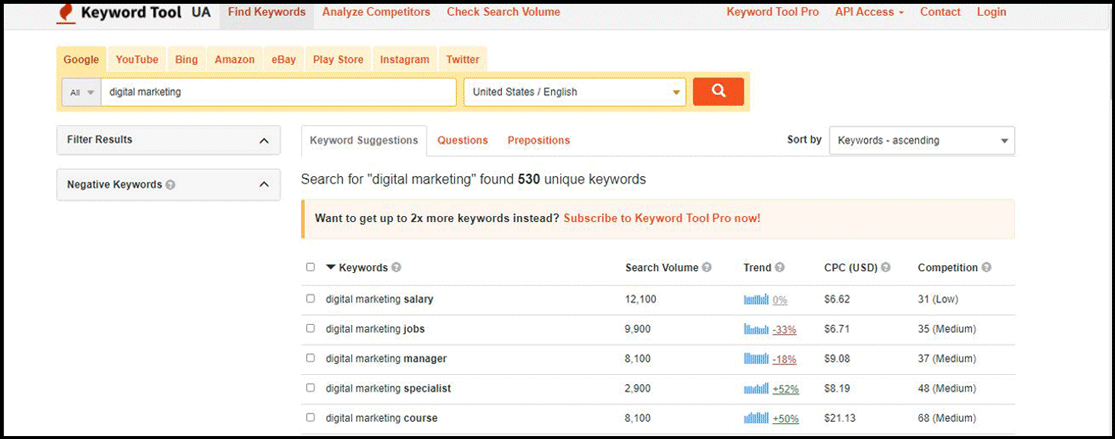 該關鍵字工具以提供最佳長尾關鍵字列表而聞名。 關鍵字工具使用搜索引擎數據來提供關鍵字列表。 該工具通過自然搜索提供一長串關鍵字提示。