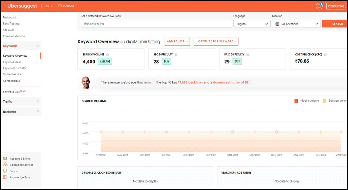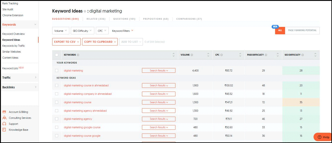 Neil Patel 的 Ubersuggest 與其他關鍵字規劃師類似,在分析部分提供了一些細節。 關鍵字規劃器根據輸入的詞根為內容提供關鍵字。 它還具有其他功能,例如比較、問題、建議。 該列表還包括作為運行付費營銷活動數據所需的關鍵字成功概率、關鍵字難度和每次點擊成本。 所有這些類別都將幫助您找到內容的關鍵字。