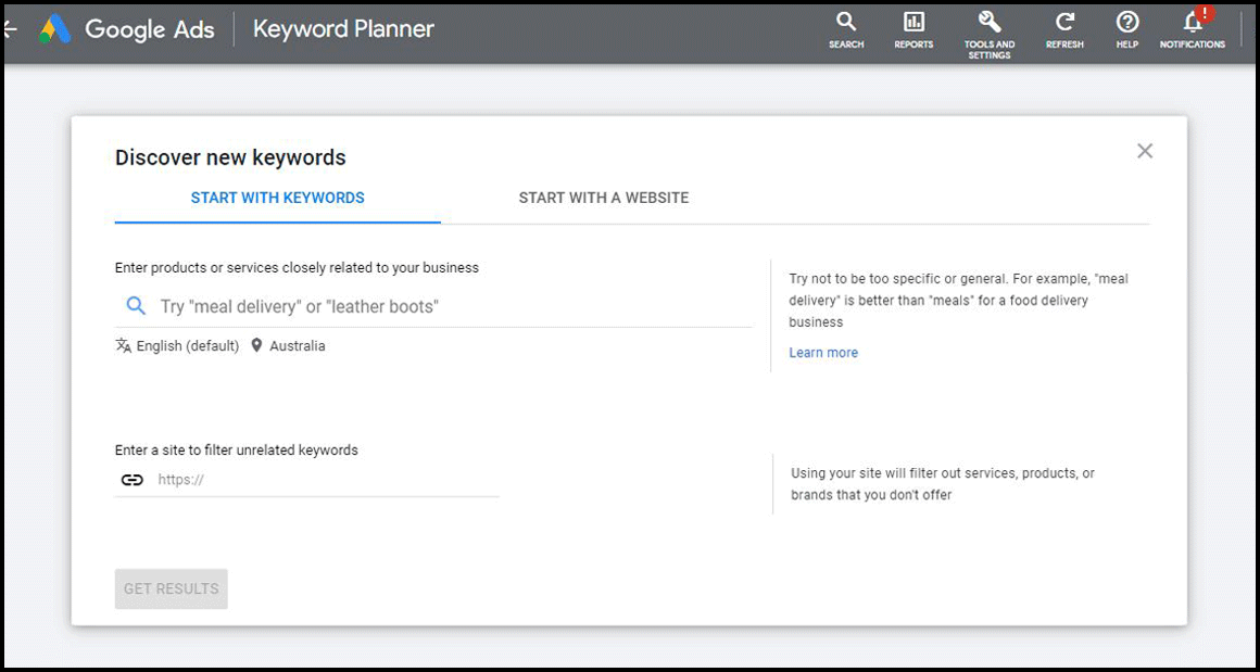 - 在關鍵字工具的主頁上,在搜索部分輸入種子詞。