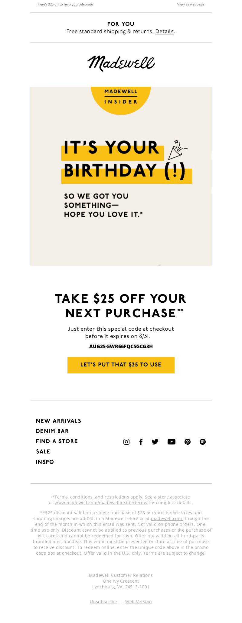 例如,在訂閱者的生日發送觸發式電子郵件會為他們的體驗增添一絲個性化,並鼓勵客戶保留。 另外,包括生日免費贈品或折扣,就像下面的 Madewell 所做的那樣,是錦上添花!