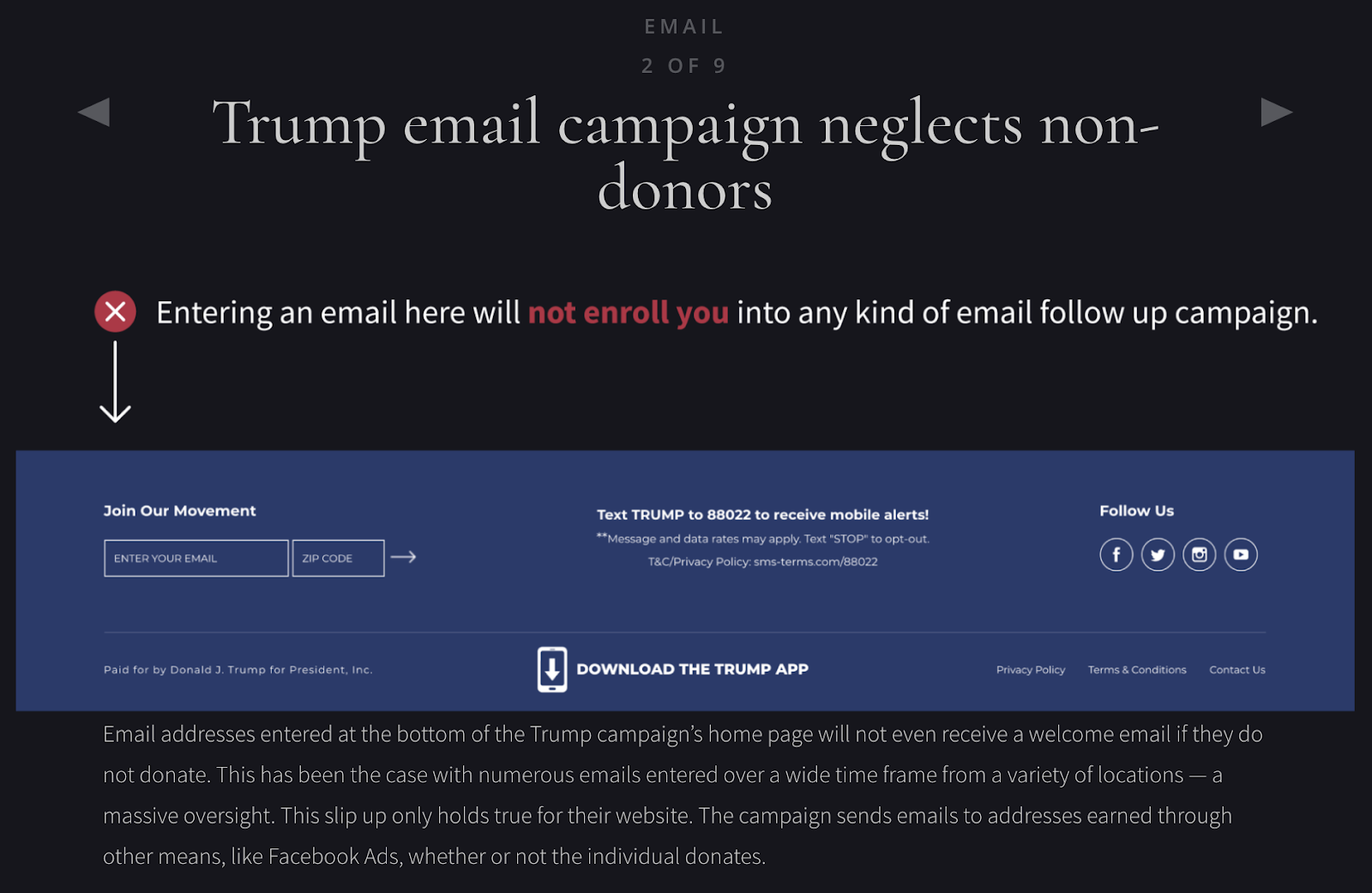 特朗普競選團隊的電子郵件策略並沒有給我留下深刻印象。 主題行浮華,甚至誤導,訴諸誘餌和轉換策略。 特朗普的電子郵件團隊正在努力爭取捐款。 然而,具有諷刺意味的是,特朗普的競選團隊在忽略將進入網站頁腳的電子郵件添加到任何類型的後續電子郵件漏斗中時,卻步履蹣跚。