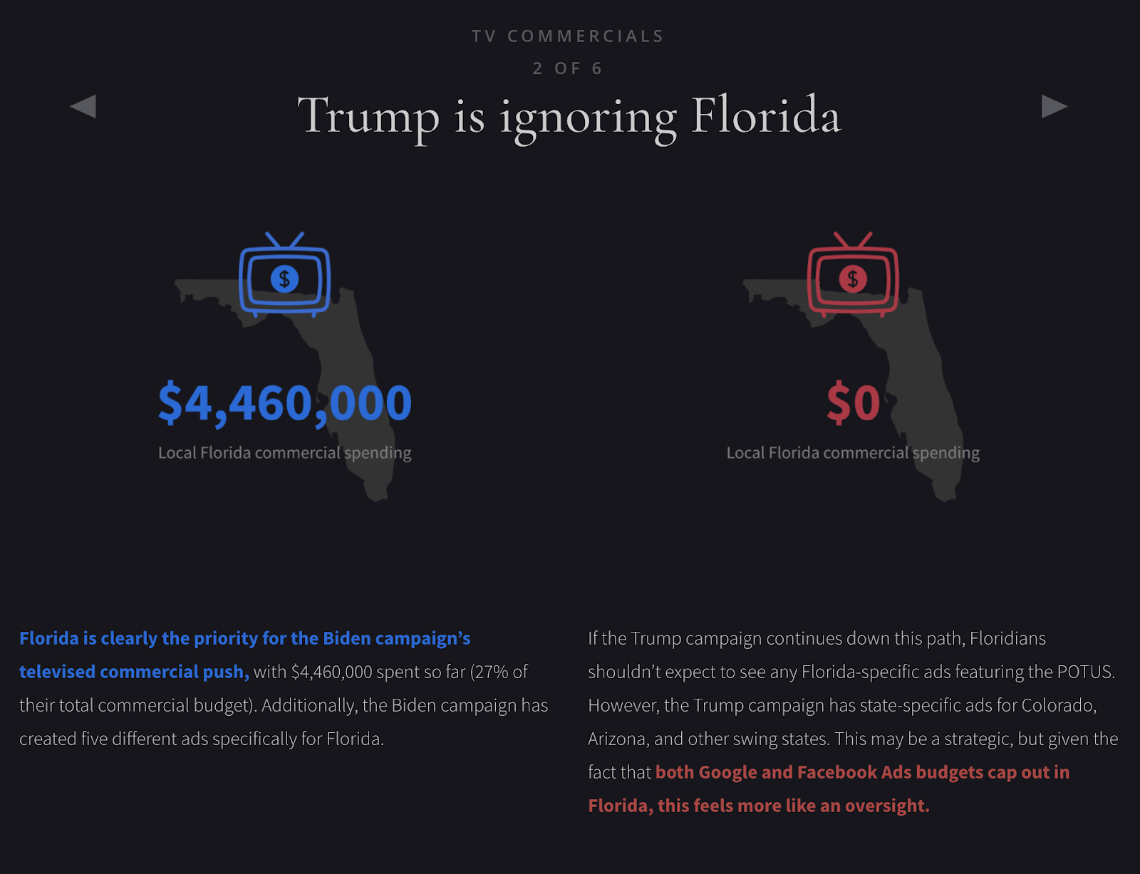 這兩個廣告系列都運行適時的廣告系列,重點是狀態驅動的廣告,這是針對其特定目標的明智策略。 特朗普團隊一直花費更多,但拜登團隊更重視搖擺州。 拜登競選團隊在五個最有爭議的州中的三個州花費更多,而佛羅里達州則從這兩個預算中獲得了最多的關注。 而且,雖然特朗普團隊一直在增加支出,但拜登團隊正在迅速行動,在過去三個月中迅速增加了支出。