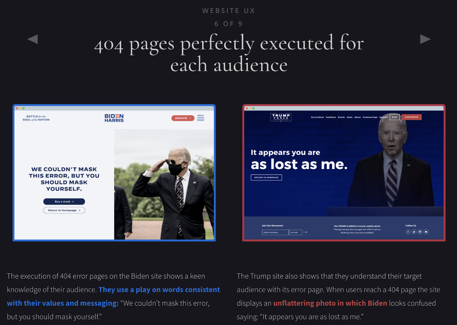 我們也忍不住查看了 404 頁。 兩者都完美地代表了他們的目標受眾:拜登負責任的戴面具者,以及特朗普的反拜登。