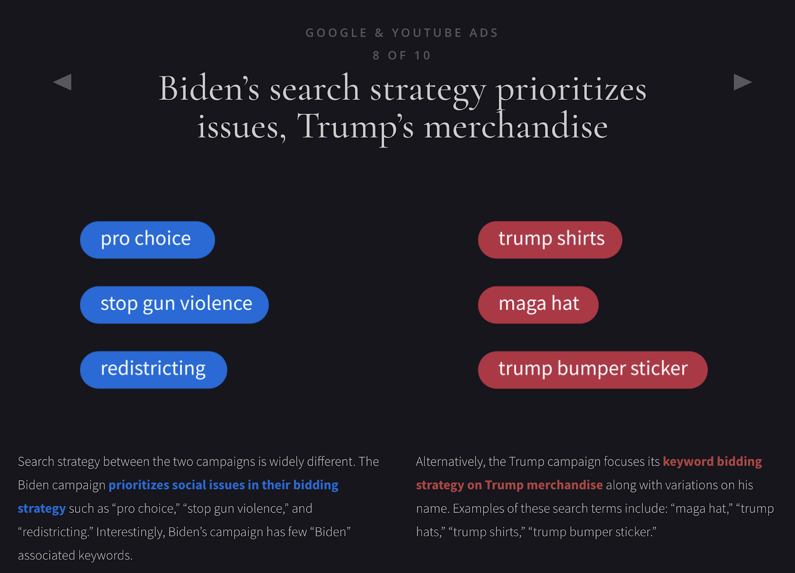 特朗普競選活動使用分裂廣告,既要散播對民主黨領導人的不信任,又要籌集資金。 這些廣告通常包括要求用戶進行片面調查,標題為:“官方民主黨腐敗責任調查”。 這些策略可能是兩面派,但我們也會對他們跳出框框表示讚賞。 兩位候選人都要求捐款,只是關注點不同。 特朗普似乎很可能從他的策略中獲得更多資金,但拜登可能會通過關注具體問題和地方州的鬥爭,從那些支持他的人那裡創造更多的“所有權”。