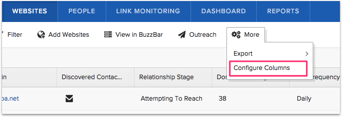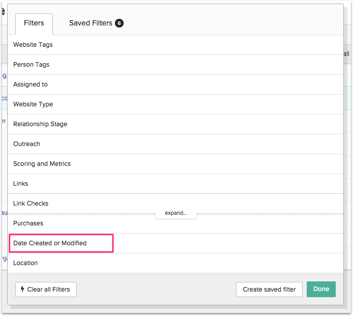 BuzzStream 具有非常先進的過濾功能,可讓您輕鬆地將已聯繫過的網站與尚未聯繫過的網站區分開來。