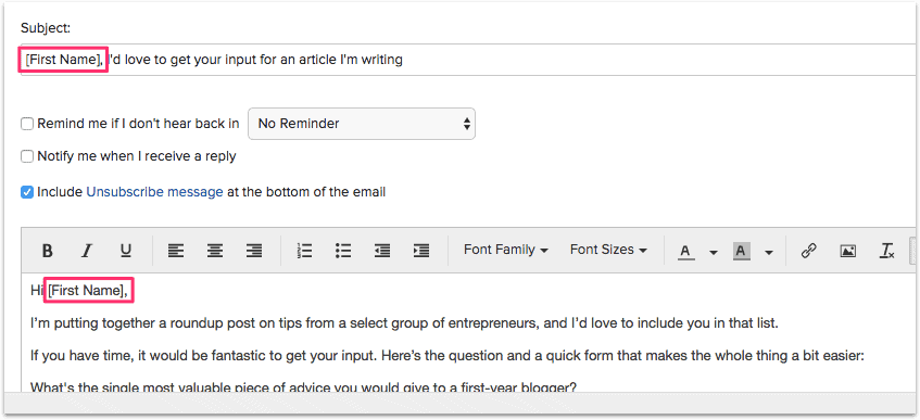然後將光標放在稱呼後,再次單擊 [First Name] 合併字段。 這會將合併字段插入您的稱呼中: