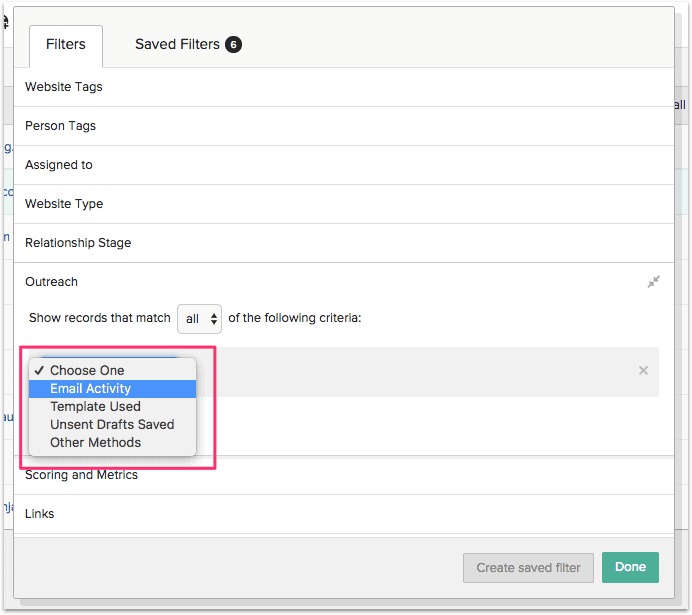 單擊“外展”過濾器並選擇“電子郵件活動”: